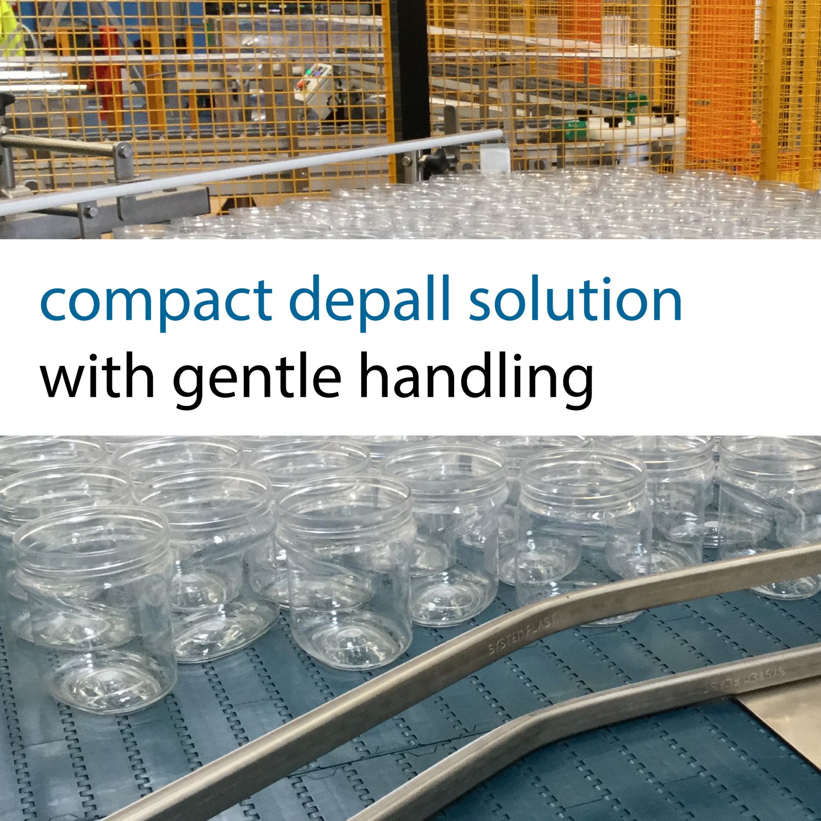 The presence of and old depalletizer affected the performance of the bottling line causing stoppages and the presence of operators who had to pick up again the PET cans. Clevertech offered an operational solution with small space required for the machine and considered also the requirement to have in the same working side the handling of empty and full pallets. The system developed is a robotic depalletizing cell with a vacuum picking head and an efficient pump able to pick also partial layers. Moreover, the value of the vacuum system produced by the picking head/blower guarantees the entirety of the cans which are not imploded. After the depalletizing process, the system divided the cans conveying them in the single conveyors towards another filling machine. The implementation of the connection has been done in order to avoid any stoppages of the cans in the transition areas and so increase the productivity of the system.